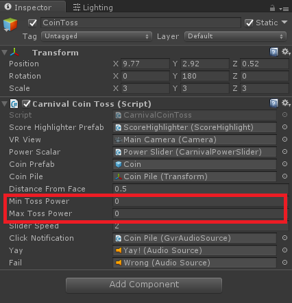 On the Coin Toss GameObject, there exists a Carnival Coin Toss script. To fix this game, you will need to change the Min and Max Toss Power from 0 to a values that enable you to land the coin when the power scale is about 50%