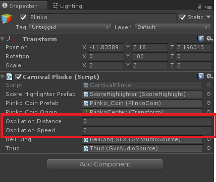 Just like the Coin Toss game, on the Plinko object there exists a component with a property that controls Oscillation Distance and Speed. Tweak those parameters to make the game more challenging.