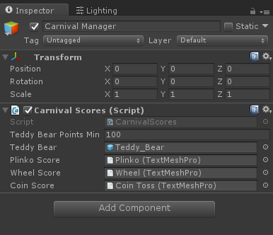 Hint: During testing, it can be helpful to temporarily lower the Teddy Bear Points Min property value of the Carnival Manager as shown in this image: