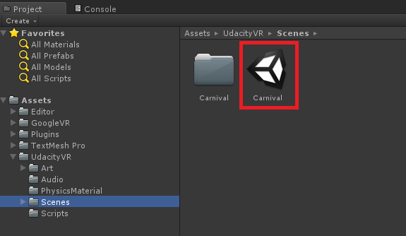 To get started, in the Project window, navigate to Assets > UdacityVR > Scenes and double-click on the Carnival scene: