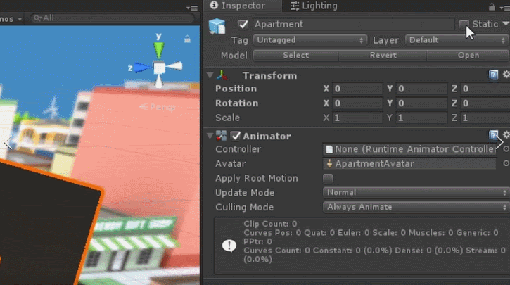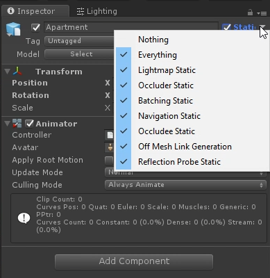 To do that, we first select the game object in the scene hierarchy. In this case, we have selected the Apartment game object. Now, if you look at the top right of the Inspector, you will see a checkbox named Static: