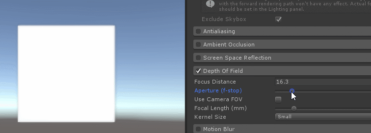 To create a blur, you will need to implement the Depth of Field effect. Then simply, change the Focus Distance or Aperture parameter. This is a value from 0 to infinite (in theory) that controls the distance at which our camera should focus.
